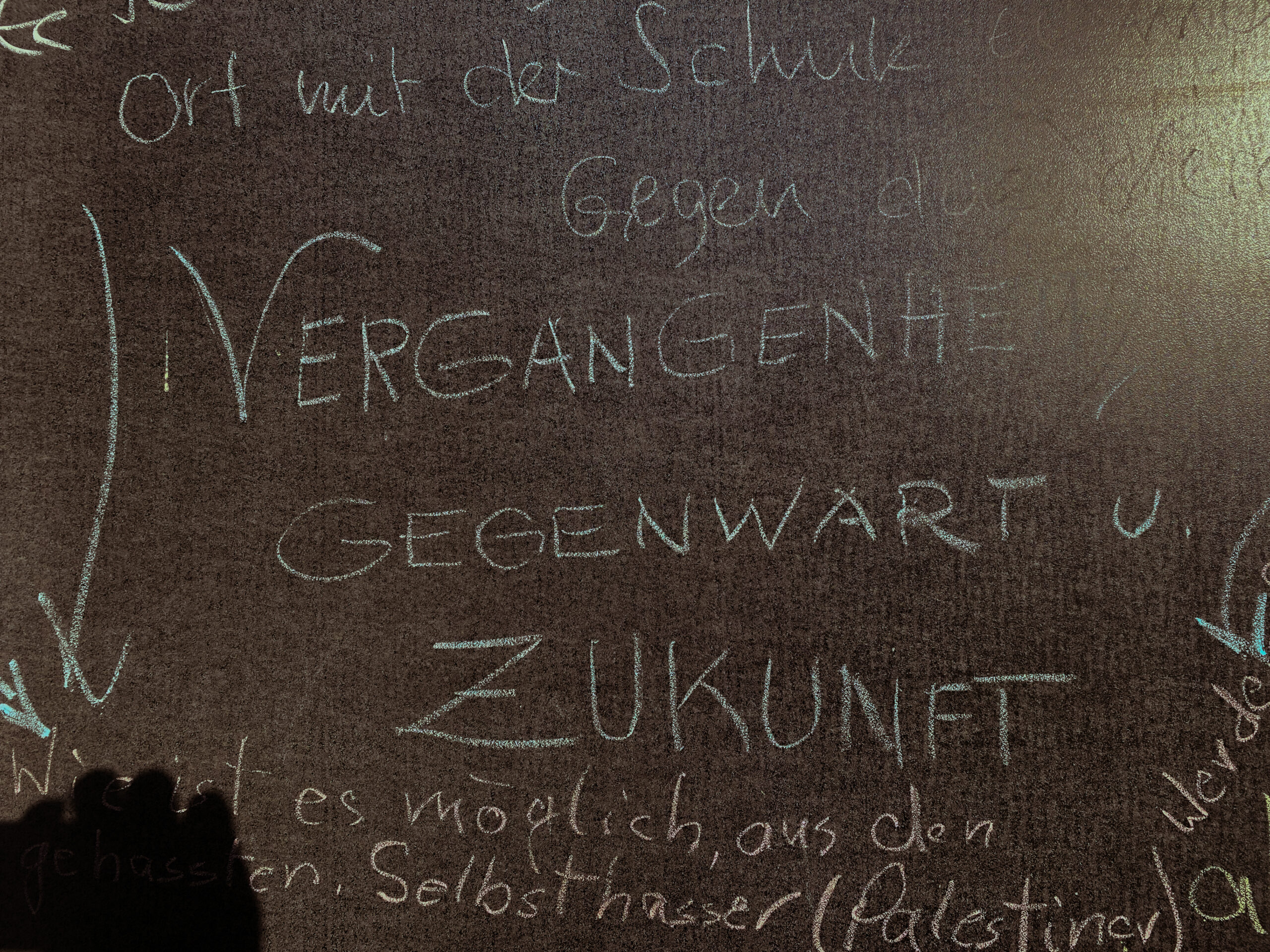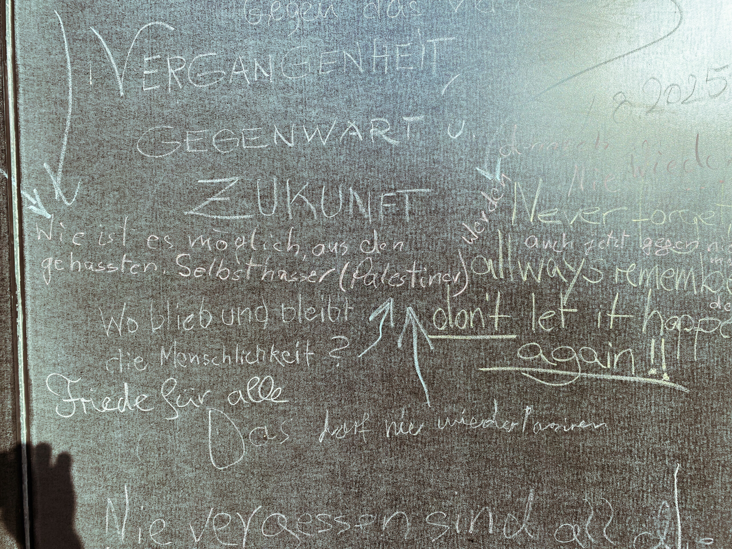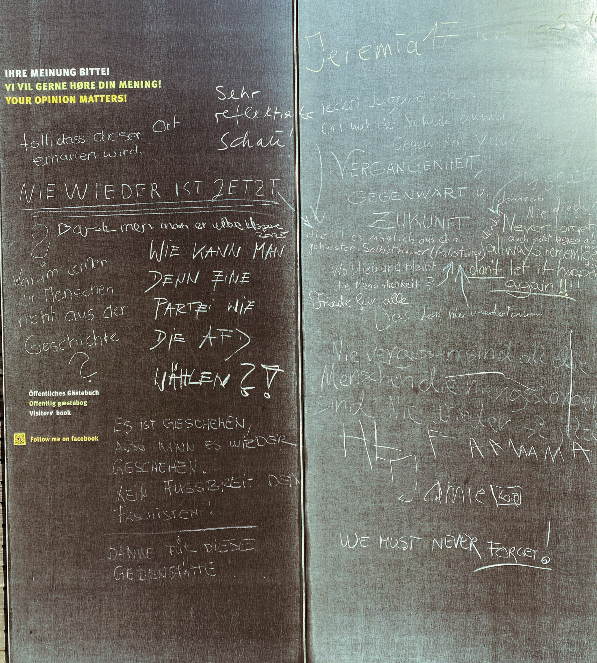 Am Haus der Gegenwart auf der KZ-Gedenkstätte hängt eine Tafel, auf der Besucher*innen Nachrichten und Gedanken festhalten können.